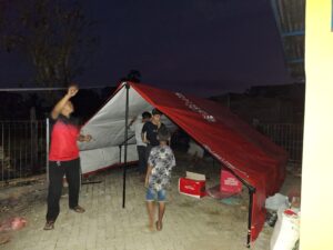 Di lokasi yang sama koordinator FK Tagana bersama masyarakat setempat juga membantu memasangkan shelter/tenda keluarga yang diberikan oleh dinas sosial kabupaten sebagai pengungsian sementara.