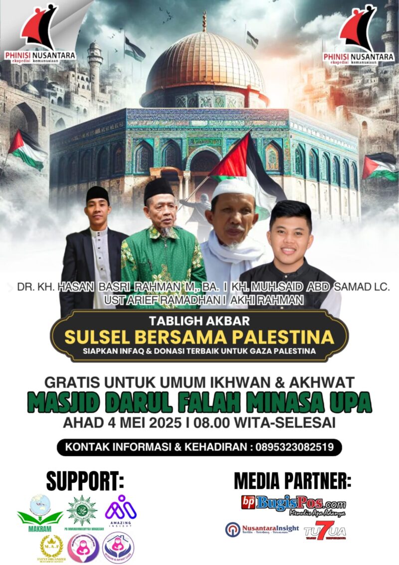 “Sekali lagi saya mengajak kepada masyarakat Sulawesi Selatan untuk meringankan kaki untuk melangkah ke tabligh Akbar “SULAWESI SELATAN BERSAMA PALESTINA”. Ingat Ki, pada hari Ahad, 4 Mei 2025 pukul 08.00 WITA,” pungkasnya.